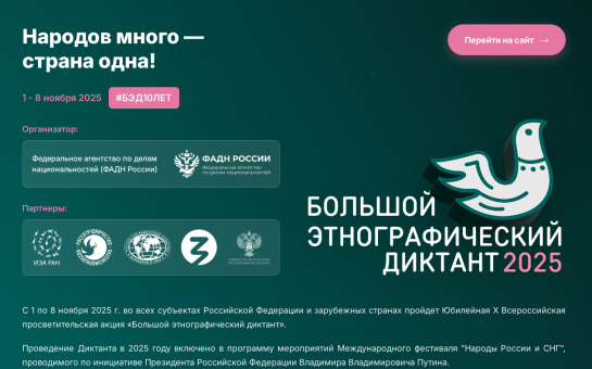 Федеральное агентство по делам национальностей в период с 1 по 8 ноября 2025 года проводит X Всероссийскую просветительскую акцию «Большой этнографический диктант»